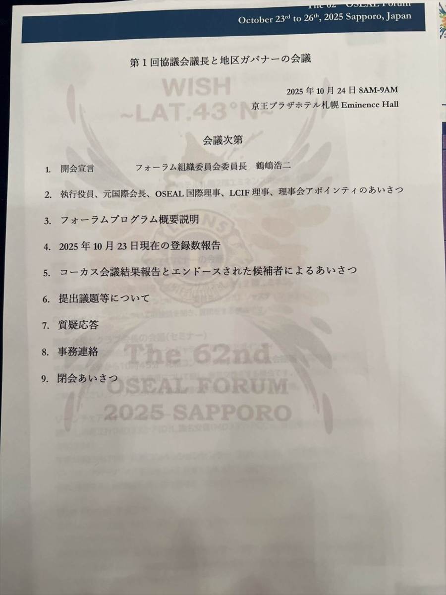 25日(土)は、京王プラザホテル札幌および札幌コンベンションセンターにて、第2回ガバナーと協議会議長会議を皮切りに、第一副会長と第一副地区ガバナー会議、国際会長とクラブ会長の会議、ゾーン・チェアパーソンセミナー、ライオンポータルセミナー、ミッション1.5セミナーなど、多くの会議やセミナーが開催されました。
